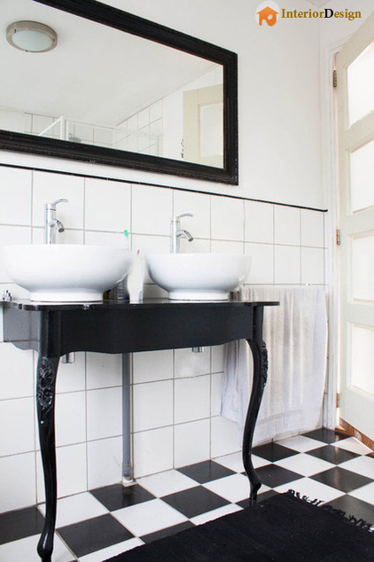 نقطه اتکای اصلی دکوراسیون این حمام این میز با پایه های طرح کلاسیکه. میز از نصفه به دیوار چسبیده و دو روشوی سفید هم روش قرار دارن. کف حمام هم با کاشی های سیاه و سفید به صورت شطرنجی کار شده .