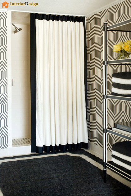 دیوار های حمام زیر با یک کاغذ دیواری طرح سیاه و سفید پوشیده شده. این ترکیب رنگ ادامه پیدا میکنه تا به پرده دوش میرسه( لبه ها سیاه و داخل سفید ). به رنگ حوله ها هم توجه کنید، همه چیز لوازم خونه نیست ! گاهی اوقات حتی خودمون هم میتونیم با رنگ دکوراسیون ست بشیم !