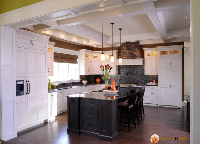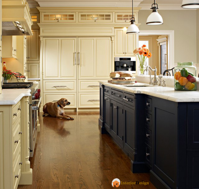این طرح خلاقانه کابینت ها رو هم ببینید. کابینت های دور آشپزخانه سفید و پیشخوان آنها تیره هستن. اما کابینت های وسط که پیشخوان اونها به نوعی میز ناهار خوری هم محسوب میشه تماما تیره هستن. من از این یکی خیلی خوشم اومد.
