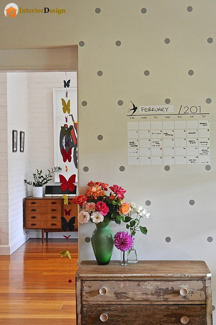 یا میتونید با برچسب های دایره ای شکل که رنگ متفاوتی با رنگ دیوار دارن اونو شبیه یک طرح کاغذ دیواری شیک بکنید. بنظر من بسته به رنگ دیوار رنگ های نقره ای، خاکستری ، فیروزه ای یا صورتی میتونن استفاده بشن.