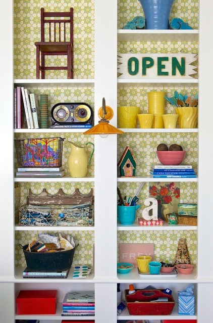 این یکی شاید کم خرج ترین باشه ولی واقعا زیبا و تاثیر گزاره. اگر قفسه ای تو منزل خودتون دارید که احساس میکنید خیلی بی روحه، با استفاده از کاغذ کادو یا کاغذ دیواری زمینه پشت اون رو بپوشانید.
